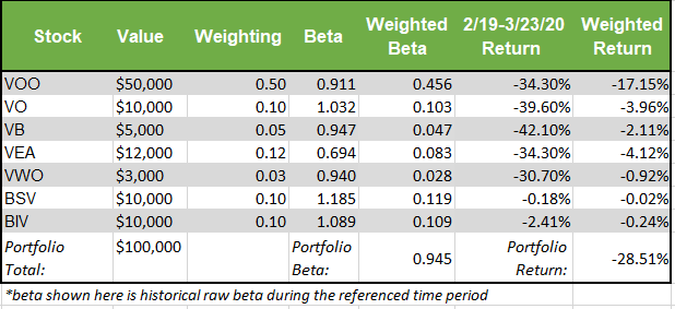 Investor A’s portfolio has a beta of 0.983, meaning that it will theoretically move up or down less than the market (1.7% better or worse) on any given day. This is the level of the investor’s total risk (assuming unsystematic risk of 0). So did this investor’s risk really change when the market sold off in 2020 from the global economic (systematic) news of COVID-19? The S&P 500 peaked on February 19, 2020 and proceeded to decline 34% to its low on March 23, 2020. What did Investor A’s portfolio do during that same time period?