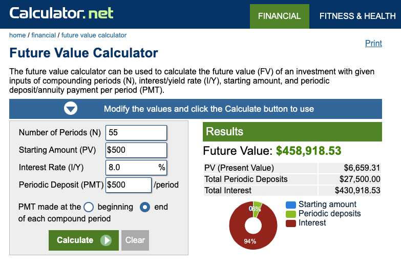 Let’s say you have $500 right now that you don’t need. You can also contribute $500 into your account every year, for the next 50 years until you expect to retire. Additionally, you are going to put your money in an S&P 500 Index fund, which might average 8% annually. Here’s what that might look like in 50 years: